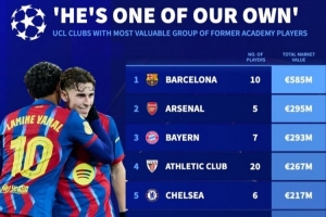 体育资讯1月20日讯 德国转会市场统计了欧冠俱乐部之中自家青训球员的身价,并列出榜单,巴萨居首,阿森纳、拜仁前三。