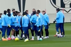 库巴西迎来19岁生日,今日训练之前巴萨球员列成两排,让库巴西从中间穿过,以拍打的方式为这位小将庆生。