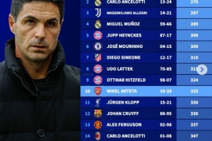 体育资讯1月31日讯 阿森纳主帅阿尔特塔在英超中已经拿到了200胜,德国转会市场盘点了五大联赛主帅单一俱乐部达成200胜所用场次情况,瓜迪奥拉268场最少,阿尔特塔325场跻身前10,所用场次少于克洛普。
