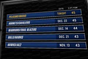 本场比赛雄鹿三分47中21,鹈鹕26中24,双方合计命中45记三分,平本赛季单场最多。