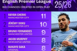 本赛季英超运动战创造重大机会榜: