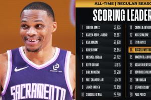 目前,国王球星威少已经得到17分,NBA生涯常规赛总得分突破27000分大关,成为历史上第14位至少27000分的球员。