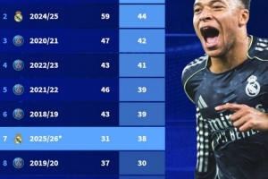 姆巴佩本赛季各项赛事38球位列生涯第7,距个人单赛季纪录还有6球