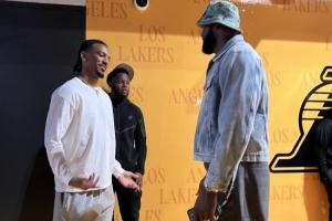赛后,詹姆斯与华盛顿指挥官四分卫杰登·丹尼尔斯见面,两人体型差距还是很大的。