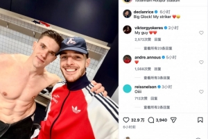 体育资讯2月23日讯 英超第27轮,阿森纳客场4比1大胜热刺,笑傲北伦敦德比。赛后,赖斯更新社媒晒出与约克雷斯合照,并盛赞了这位瑞典神锋。
