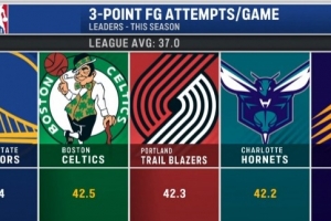 本赛季三分出手球队TOP5:勇士、绿军、开拓者、黄蜂、太阳