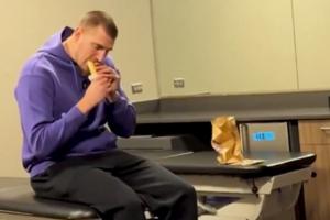 在视频中,约基奇首先说道“因为那个(选秀广告)我从不吃Taco Bell。”镜头一转,是他在更衣室悠闲品尝卷饼一幕。