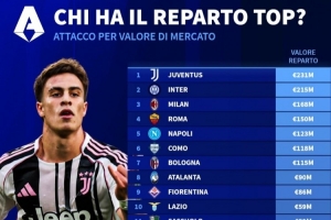 德转列意甲各队前锋总身价排行:尤文2.31亿欧居首,国米第二