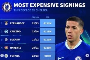 切尔西近年引援榜:恩佐压凯塞多居首,卢卡库、哈弗茨均上亿