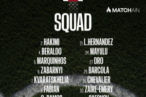中场:8-法比安、17-维蒂尼亚、19-李刚仁、24-马尤卢、27-德罗、33-扎伊尔·埃梅里、87-若昂·内维斯